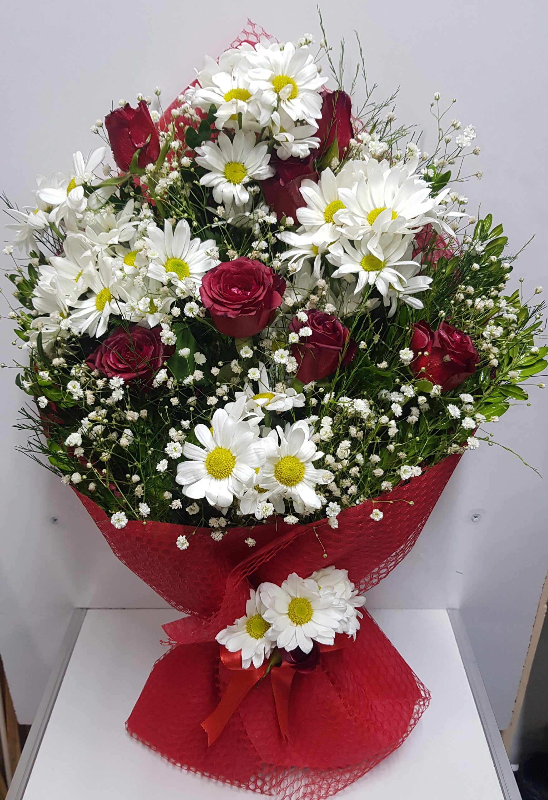 7 kırmızı gül ve beyaz papatya buket