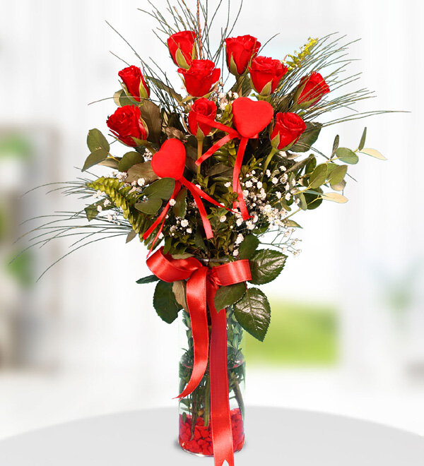 9 kırmızı gül vazo kalp süs